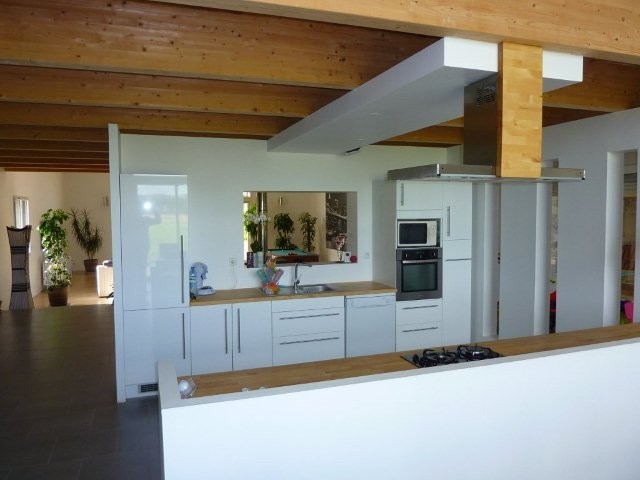 Rez-de-chaussée sur carrelage et parquet composite: Entrée avec nombreux rangements, bureau, salle de réception traversante de 200m² proprosant de belles vues sur la nature à travers d'immenses ouvertures et comprenant salon / séjour, cuisine AE ouverte, espace salle à manger, coin détente et billard près du poêle à bois. Une buanderie spacieuse avec accès au garage, un wc et une réserve (possible salle d'eau) viennent compléter le rez-de-chaussée.