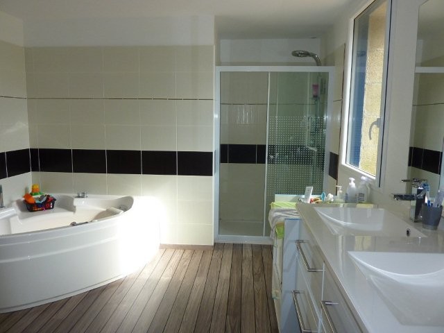 Etage sur parquet flottant: Palier en mezzanine, grande chambre en suite parentale avec dressing et salle de bain (double vasques, bain et douche balnéo), 2 chambres enfants, wc séparé.
