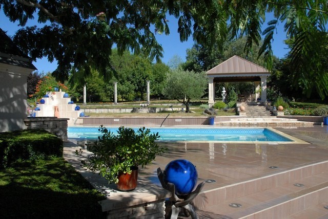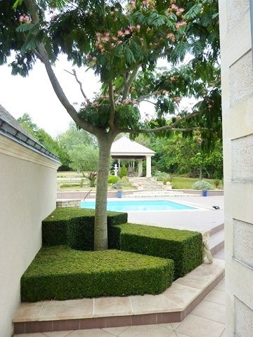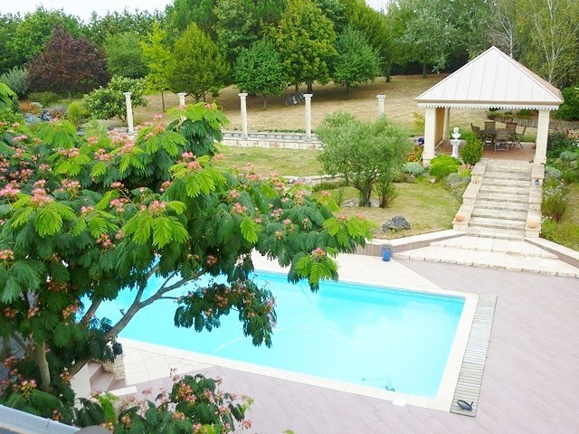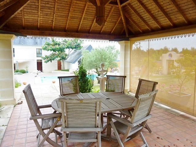 Terrasse de 250m² en pourtour de la maison, belle espace aménagé en façade sud avec toile tendue pour la belle saison. La terrasse et ses cheminements permettent de relier la Demeure à sa maison d'amis, à la salle de sport, au kiosque, à la piscine, au parc et au parking.