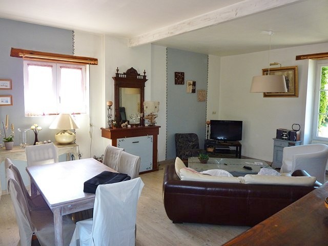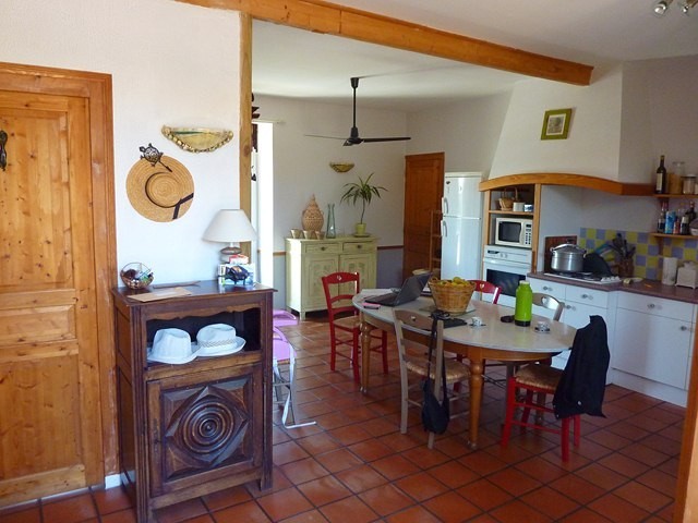 Rez-de-chaussée: Sol carrelage et terre cuite, belle hauteur sous plafond. Entrée dans grande cuisine traversante AE avec coin repas et accès terrasse, bureau avec accès terrasse, séjour-salle à manger traversant avec cheminée, local buanderie. Accès studio indépendant.