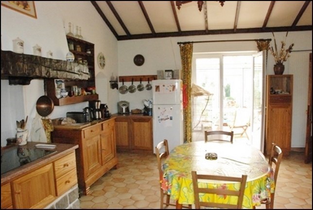 Rez-de-chaussée sur carrelage et parquet: véranda chauffée ouverte sur cuisine avec coin repas, arrière cuisine et réserve/cave à vin (ancien four à pain), séjour avec cheminée insert et accès