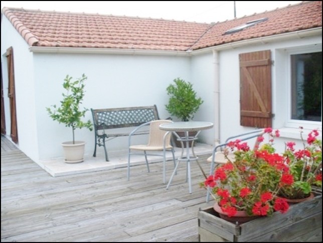terrasse plein sud, 1 grande chambre avec rangement et accès terrasse, 1 chambre avec salle d'eau (vasque et douche), 2 chambres (ou chambre et bureau), 1 salle de bain avec vasque, bidet, bain et