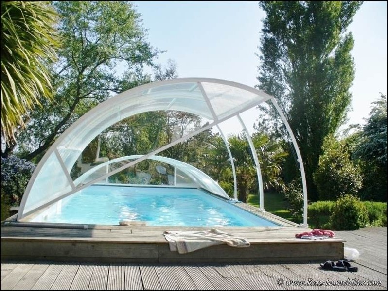 Piscine: Construction traditionnelle, sous dome escamotable. Bassin éclairé 8 x 4m, accès par escalier, traitement par électrolyse.