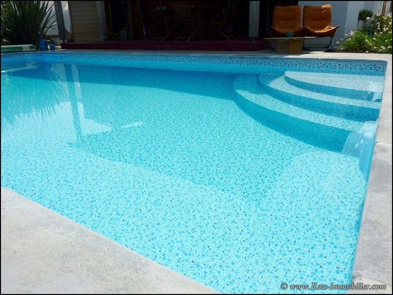 Piscine: Bassin 9 x 4m, petit et grand bain, liner récent, accès par escalier, nage à contre-courant, éclairage bassin, chauffage par pompe à chaleur.