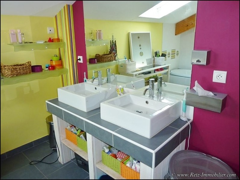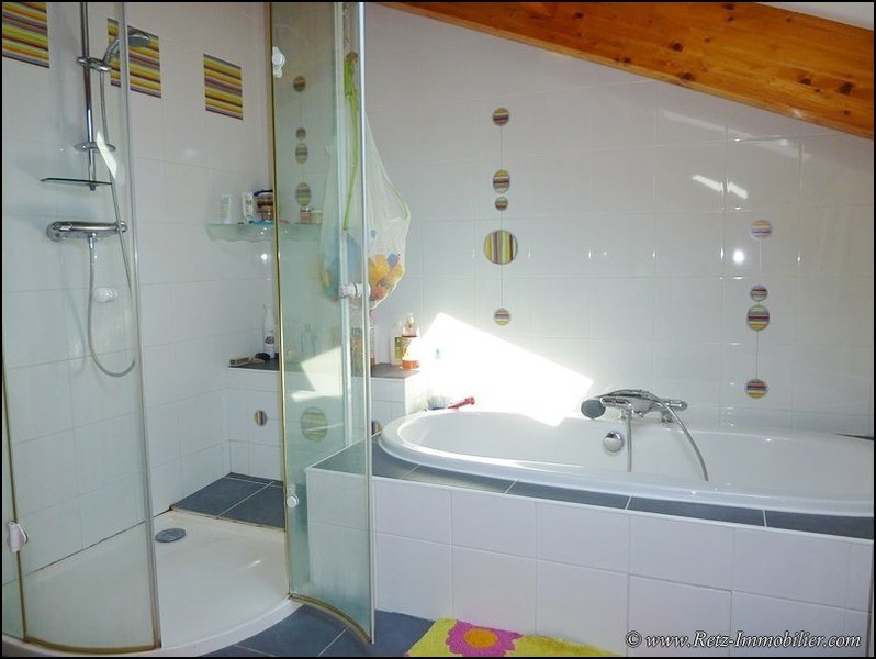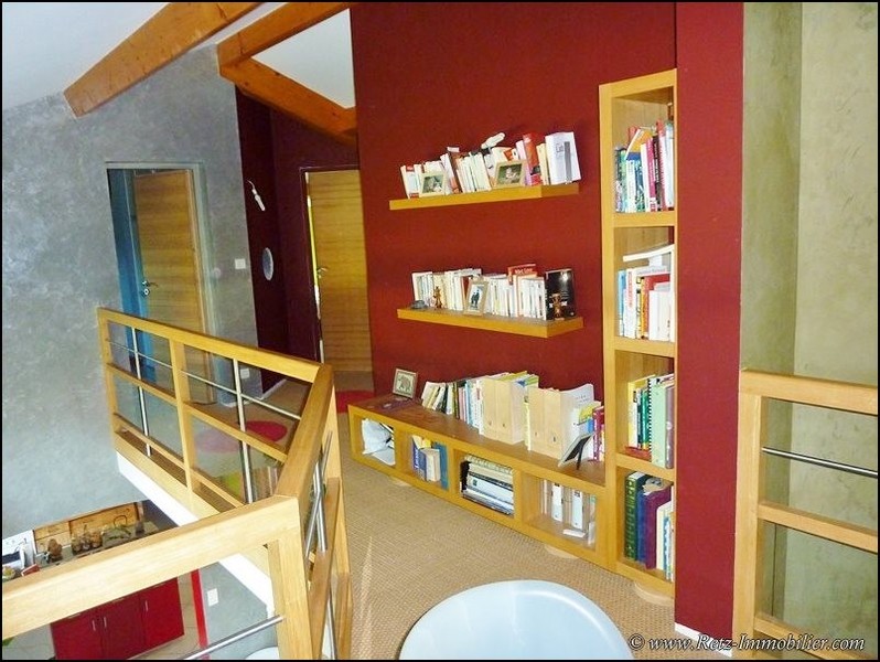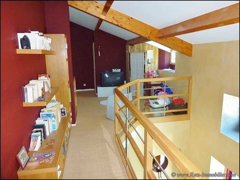 Etage: Grand palier en mezzanine avec coin TV bibliothèque, 3 chambres dont 2 avec rangements, salle de bain (baignoire, douche et double vasque), wc indépendant.