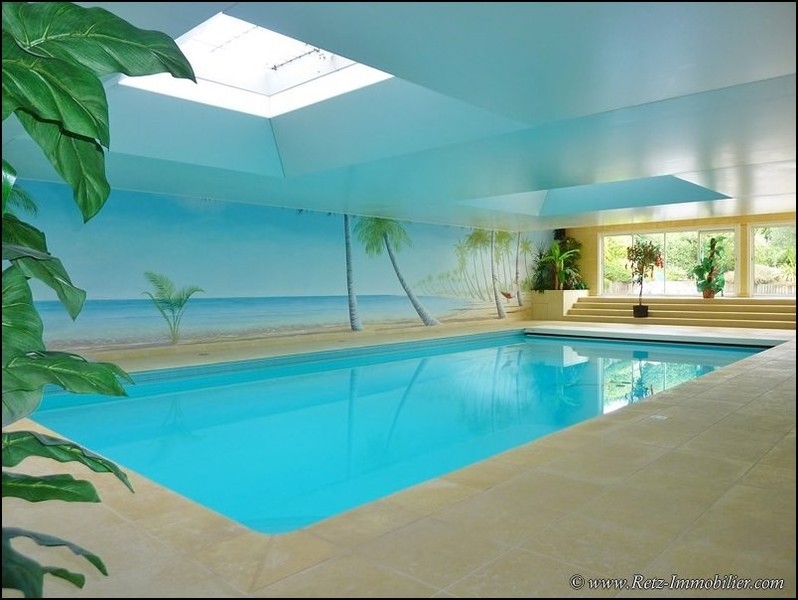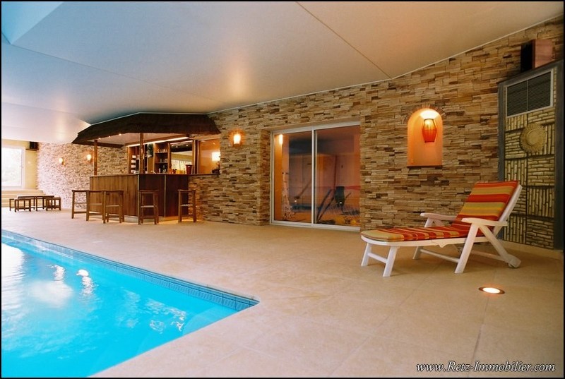 Piscine intérieure et salle de sport (bâtiment 200m² contigu à la demeure): grande plage en dalles anti dérapantes sur le pourtour du bassin, bar équipé, système audio, gestion automatique de