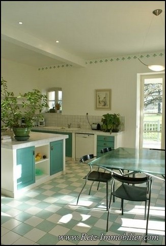 Porche couvert, hall d'entrée, cabinet de toilette et wc séparé, grande cuisine AE avec îlot central et coin repas + accès terrasse couverte expo Sud-Est, entrée de service, arrière cuisine /