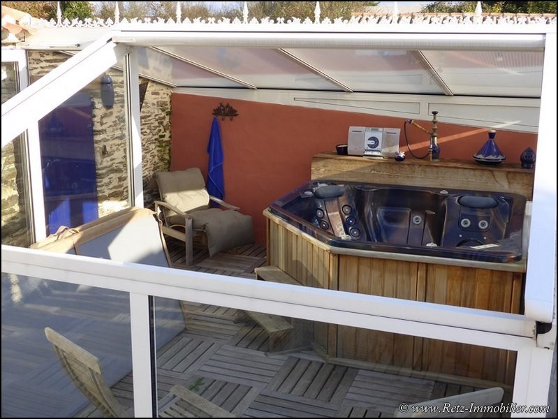 Jacuzzi 5 places, sous abri véranda avec toit électrique escamotable et rideau de protection solaire.
