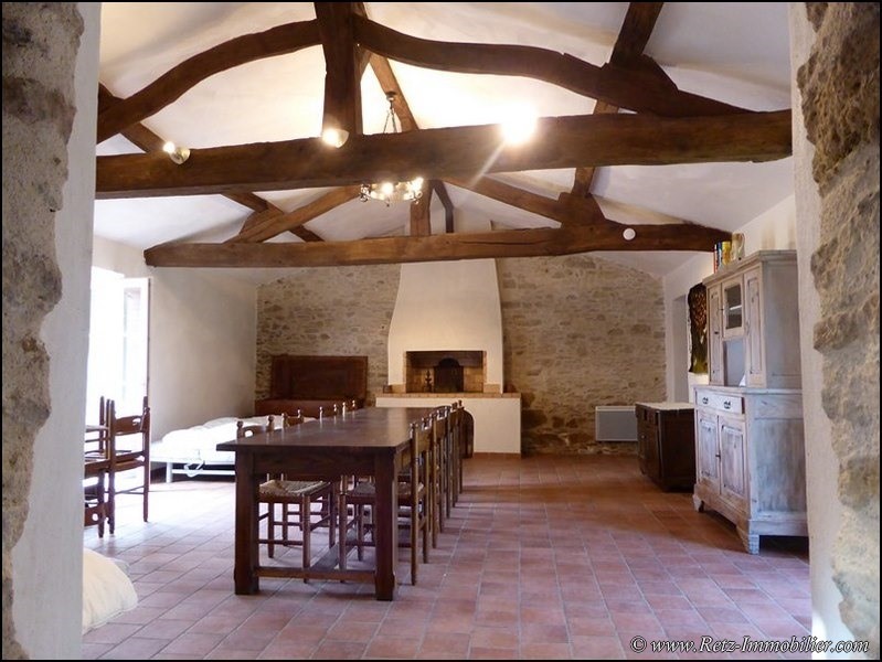 Entrée dans salle de séjour - salle à manger avec cheminée (48m²), cuisine américaine avec coin repas (31m²) et beau four à pain, salle d’eau (douche, vasque), wc séparé.