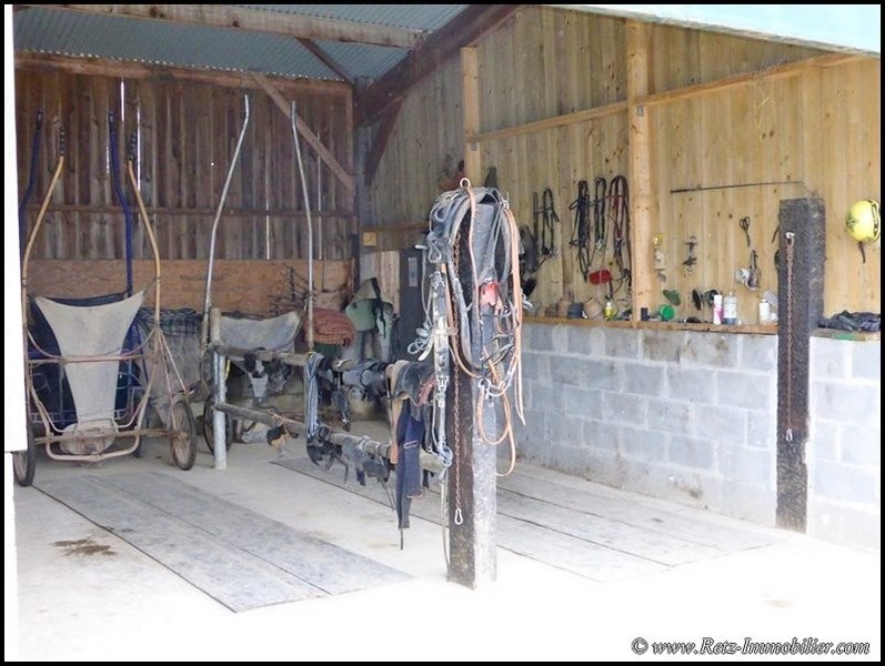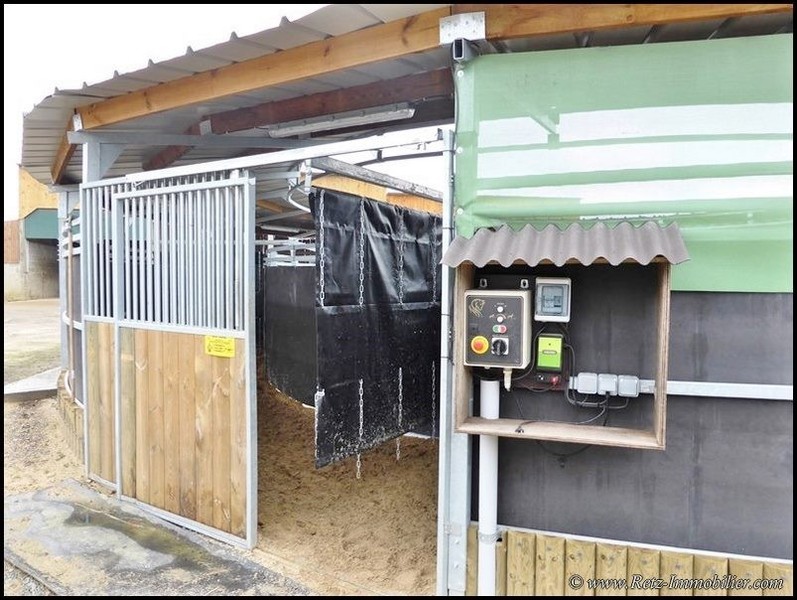 8 boxes, 4 stabulations, marcheur (neuf) couvert pour 6 chevaux avec programmateur, 2 douches intérieures (eau chaude et froide), aire de préparation couverte pour 2 chevaux + attelage, piste sablée