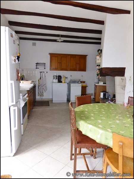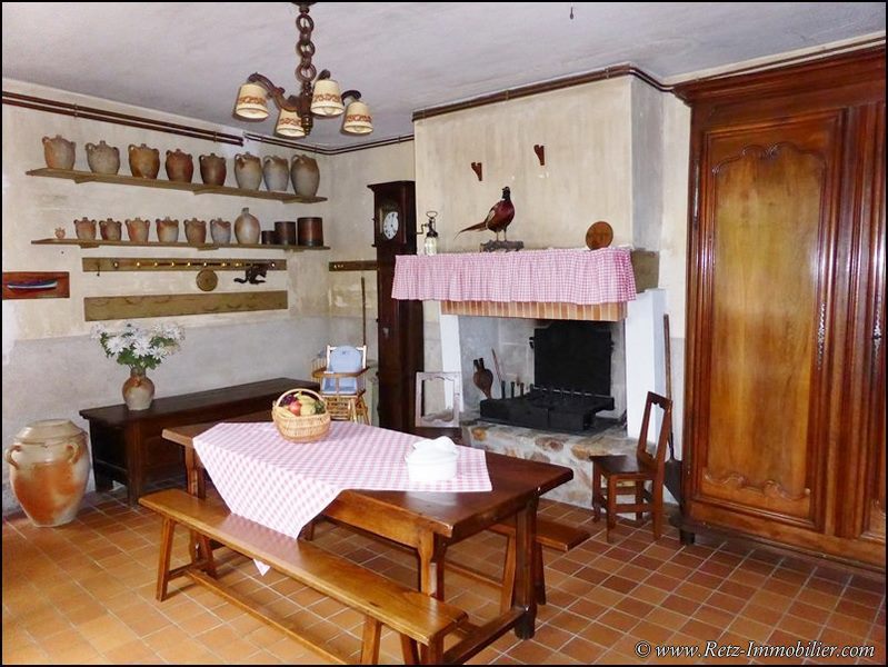 salle à manger rustique avec grande cheminée et accès terrasse, cuisine avec coin repas, cheminée et accès cour, cellier, wc séparé avec lave-mains.