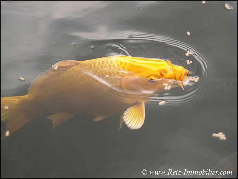 Extérieur: Cour à usage de parking d'accueil, bassin Koi 6x3m avec animation de jets d'eau éclairés + bassin à poissons 5x2m avec cascade (filtration, aération &