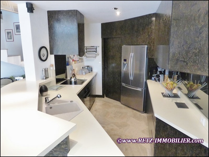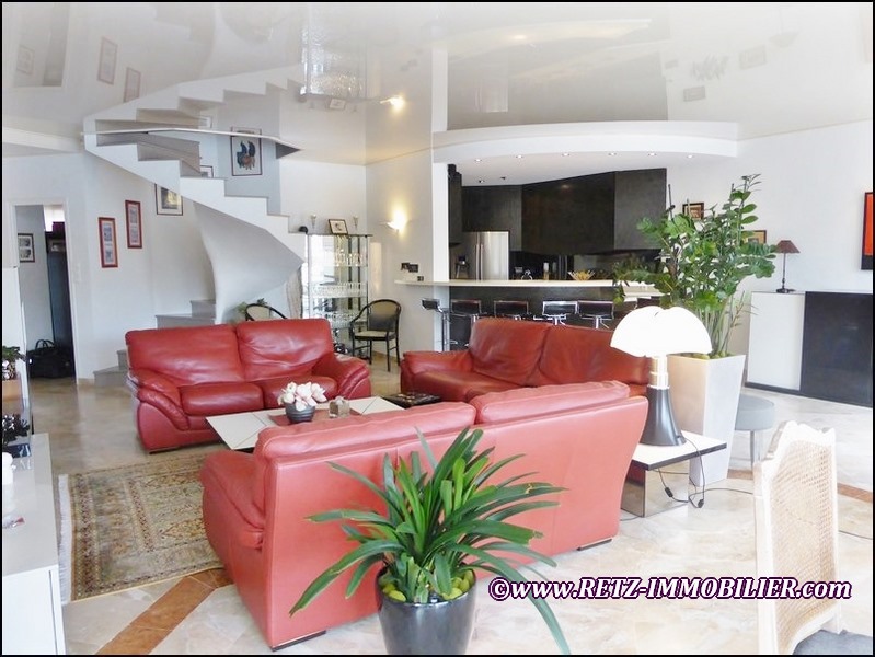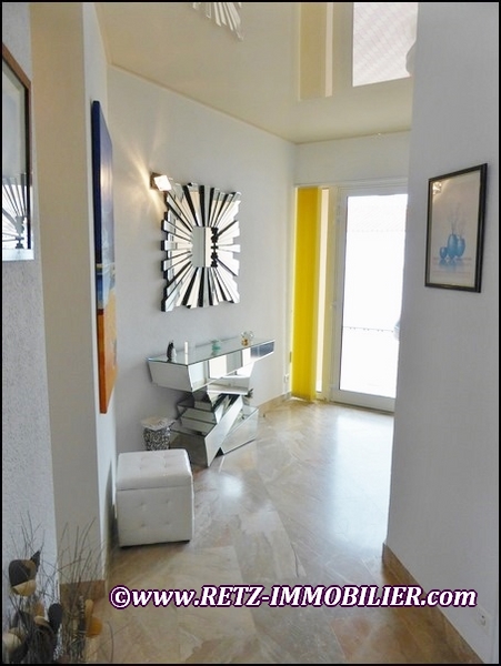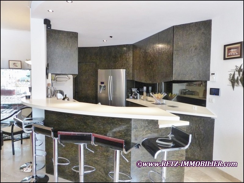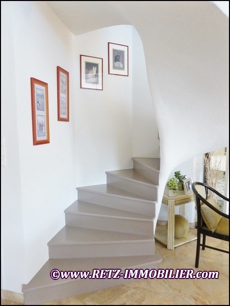 Rez-de-chaussée (sol marbre et plafond tendu Barrisol): Hall d'entrée avec rangements, wc indépendant avec lave-mains, grand séjour avec espace salle à manger en bow-window, bar et cuisine AE ouverte, grandes ouvertures au Sud vers la