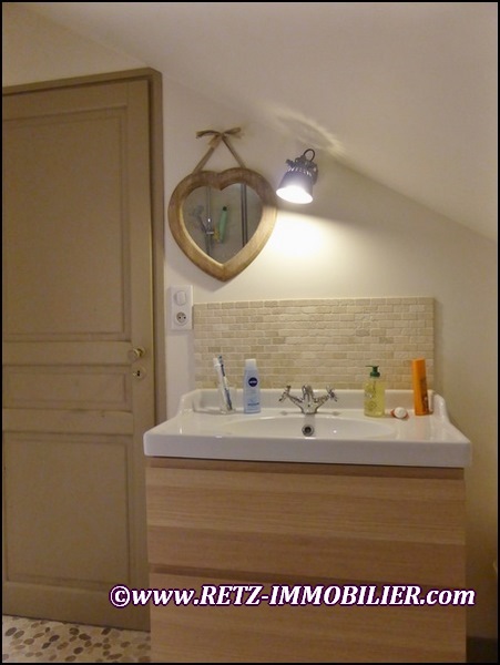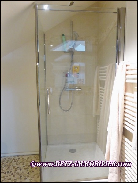 Etage: Sol parquet chataignier, fermes de charpente apparentes; Palier spacieux avec petit salon, chambre 2 avec rangement, chambre 3 avec rangement, salle d'eau (vasque, douche, sèche-serviette, wc).