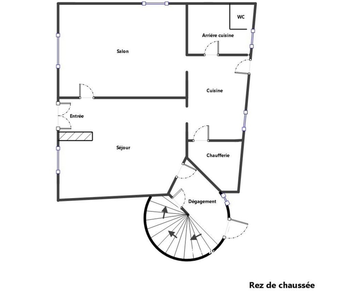 Rez-de-chaussée : Petit hall d'entrée principale ; Séjour avec cheminée (poêle à bois en place) ; Salle à manger avec cheminée (poêle à bois en place) ; Cuisine aménagée avec porte fenêtre vers jardin ; Arrière cuisine ; Chaufferie ; Sanitaires ; Tour (dégagement, entrée secondaire et cage d'escalier).