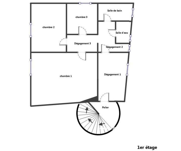 Etage 1 : Dégagement en petit salon ; Chambre 1 avec cheminée monumentale décorative ; Dégagement ; Chambre 2 ; Chambre 3 ; Salle de douche (vasque, douche, sèche-serviette) ; Salle de bain (2 vasques, baignoire fonte, wc) ; Tour (cage d'escalier).