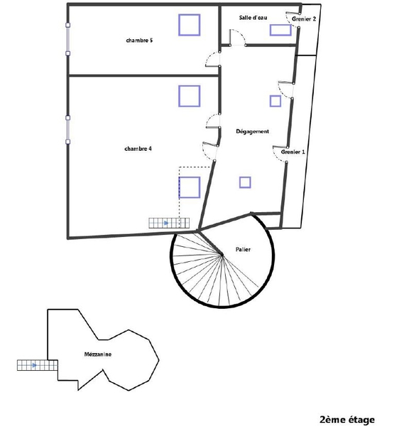 Etage 2 : Accès par volée d'escalier en colimaçon en dalles de chêne massif desservant un remarquable palier ancestral sous plafond en torchis ; Grand dégagement avec rangements en soupente ; Chambre 4 (actuellement en salle de cinéma / sport / multimédia) avec mezzanine ; Chambre 5 ; Salle de douche (vasque, douche, sèche-serviette, wc). Nota : La chambre 4 pourrait être divisée laissant la possibilité d'une maison avec 6 chambres.