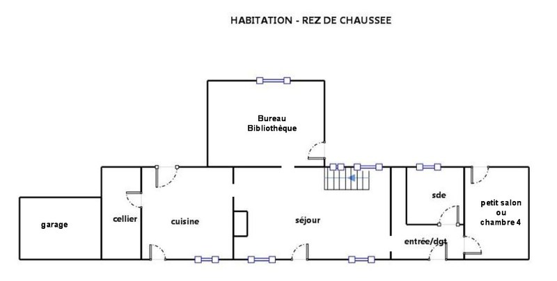 Rez-de-chaussée : Hall d'entrée avec espace de rangement ; Séjour avec cheminée à foyer fermé 14KW et porte-fenêtre ; Cuisine à vivre équipée (piano gaz 5 feux + 3 fours électriques, hôte Whirlpool, lave-vaisselle Bosch) avec véritable four à pain (actuellement à usage décoratif) et 2 portes-fenêtres vers terrasse et jardin ; cellier / chaufferie / buanderie ; Bureau / bibliothèque avec porte-fenêtre vers terrasse (possibilité chambre 5 avec SdE) ; Petit salon (ou chambre 4) avec cheminée traditionnelle et porte-fenêtre ; Salle d'eau (Vasque, bain, douche, sèche serviette, wc japonais).