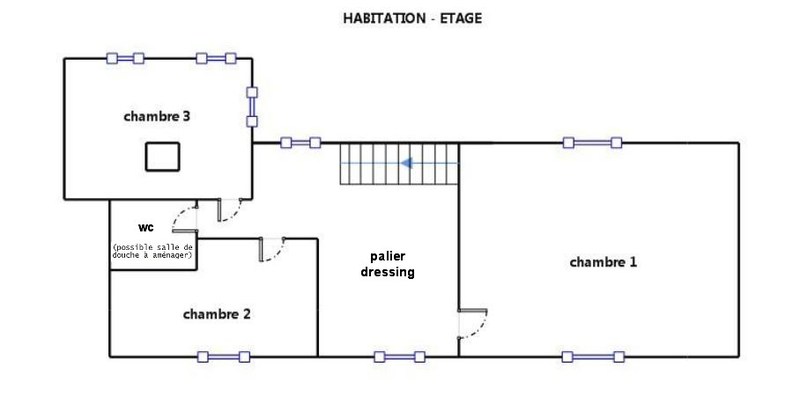 Etage sur parquet authentique rénové : Palier Dressing ; 3 chambres (14, 26 et 40m²) ; Local pour création salle de douche (wc sanibroyeur et cumulus électrique ok).