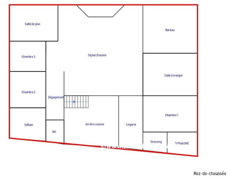 Rez-de-Chaussée : Entrée principale sur grande pièce de vie avec poêle à bois et cuisine AE ouverte (cuisinière 2 feux gaz et 2 plaques à induction, hôte, four) ; Arrière cuisine / cellier ; Salle à manger avec baie coulissante sur terrasse et jardin ; WC séparé ; 2 chambres d'enfant ; Salle de bain (meuble vasque, plan à langer, douche multi jets, baignoire, sèche serviette) ; Suite parentale dont chambre, espace dressing, salle de bain (meuble vasque, douche italienne, baignoire balnéothérapie pour 2 personnes, sèche-serviette, wc) ; Bureau avec rangements (possible chambre 4 ou salon bibliothèque) ; Pièce à usage de salle de jeux (possible chambre 5 ou salon) ; Buanderie / chaufferie.
