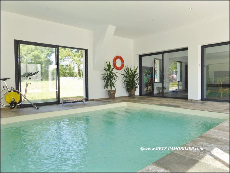 44 - SAINT ETIENNE DE MONTLUC (44360) à 12km de NANTES, Maison contemporaine de belle facture édifiée en 2018 offrant 393m² hab. (332 Carrez), piscine intérieure chauffée, grand séjour avec cheminée foyer fermé, cuisine ouverte AE, 2 suites + 3 chambres, ... Dépendances dont porche, préau, garage, atelier (possible appartement indépendant de 50m²). L'ensemble sur 3300m² dont cour, parking, terrasse en patio, jardin arboré. Secteur calme et agréable entre ville et campagne. RARE.