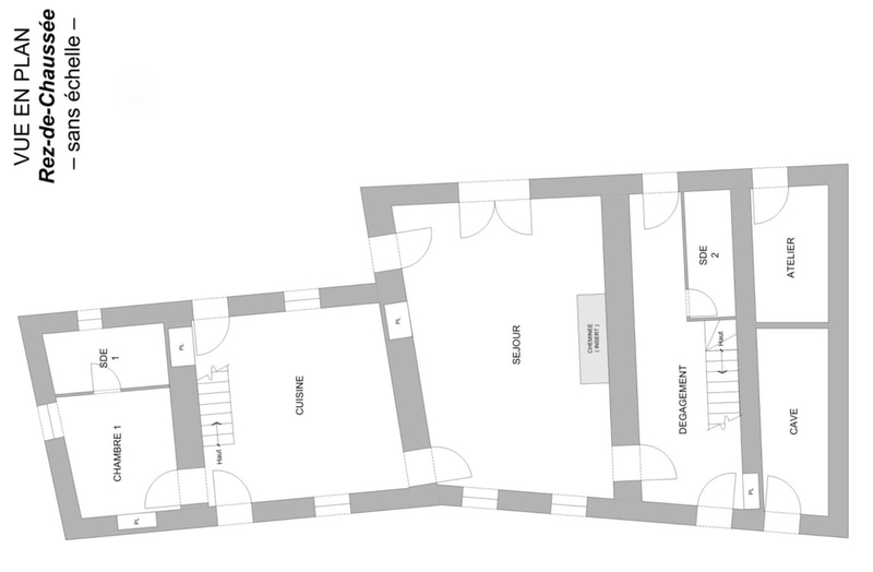 Rez-de-chaussée : Entrée traversante ; Salon Salle à manger avec poêle à bois et double accès à la terrasse ; Cuisine aménagée équipée* (nombreux rangements, plaques de cuisson à induction, hotte tubée, four encastré à chaleur tournante + tournebroche, lave-vaisselle, frigo-congélateur, four mixte micro-onde/grill) avec accès terrasse et bel escalier ancien ; Chambre 1 avec salle d’eau (meuble vasque, douche italienne, rangements, sèche-serviette, WC) ; Dégagement avec cage d’escalier secondaire ; Sanitaires (WC, lave-mains, douche et coin lingerie avec branchement/évacuation pour machine à laver le linge).