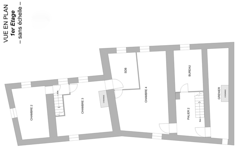 Étage : Palier ; Bureau ou chambre 2 ; Chambre 3 avec cheminée décorative ; Chambre 4 avec rangement et petit salon ; Salle de bain et douche (meuble vasque XL, rangements, douche, baignoire, bidet, sèche-serviette, WC) ; Dégagement avec arrivée d’escalier secondaire ; Petite pièce (possible dressing ou création salle d’eau) actuellement à usage d’atelier ; Grenier de stockage.