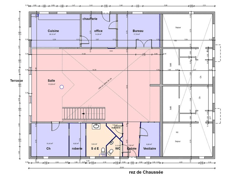 Rez-de-chaussée : Hall d’entrée ; Dressing/vestiaire ; WC avec lave-mains ; Petit espace laverie ; Grande salle de vie (séjour, salon, salles à manger, musique, …) ouvrant sur terrasse et jardin ; Cuisine ouverte AE avec coin repas et accès terrasse et jardin ; Arrière cuisine/cellier/chaufferie ; Bureau ; Chambre 1 en suite parentale avec dressing et salle de douche (vasque, douche italienne, wc).