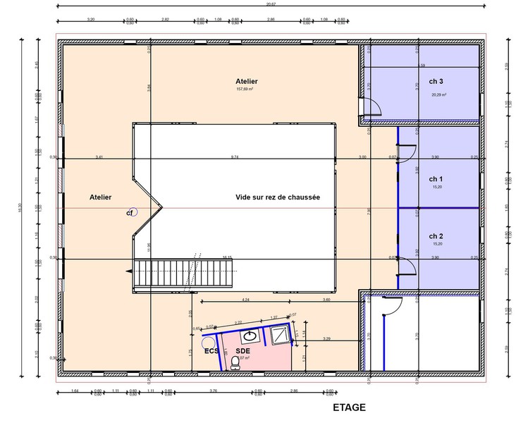 Étage : Immense espace ouvert en mezzanine offrant divers espaces et ambiances : Bureau, atelier, salon bibliothèque, coin détente, … ; Chambres 2, 3 et 4 ; Salle de douche (vasque, cabine de douche, wc).