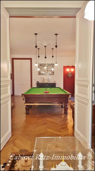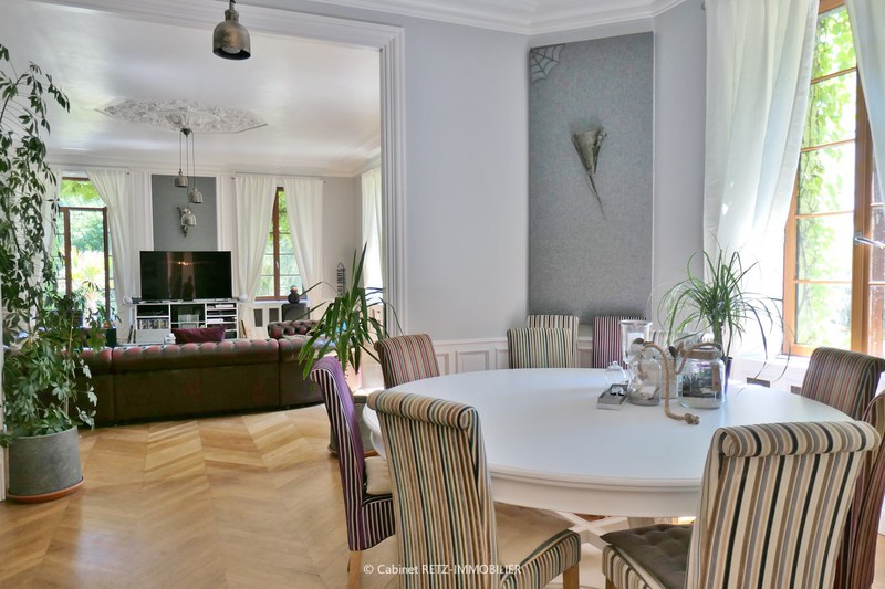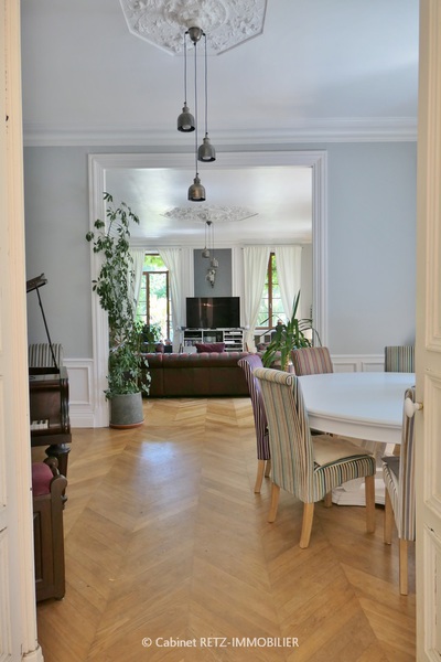 Rez-de-chaussée : Hauteur sous plafond 3,50m, sols d’origine en parquet chêne massif, carreaux de mosaïques et tomettes.