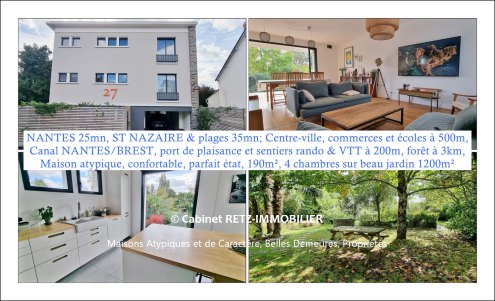 À 25mn de NANTES, 35mn de SAINT NAZAIRE & des plages, Maison atypique baignée de lumière, confortable et bien équipée, en parfait état, située dans une rue calme d’un secteur privilégié de BLAIN permettant tous déplacements à pied ou à vélo… Commodités du centre-ville à 500m, berges du Canal de NANTES à BREST avec voie verte et piste VTT à 150m, port de plaisance à 200m Château à 400m. Env. 190m² hab., 4 chambres dont une suite, bureau et beaux espaces de vie sur jardin remarquable de 1189m² avec dépendance, garage, puits, …