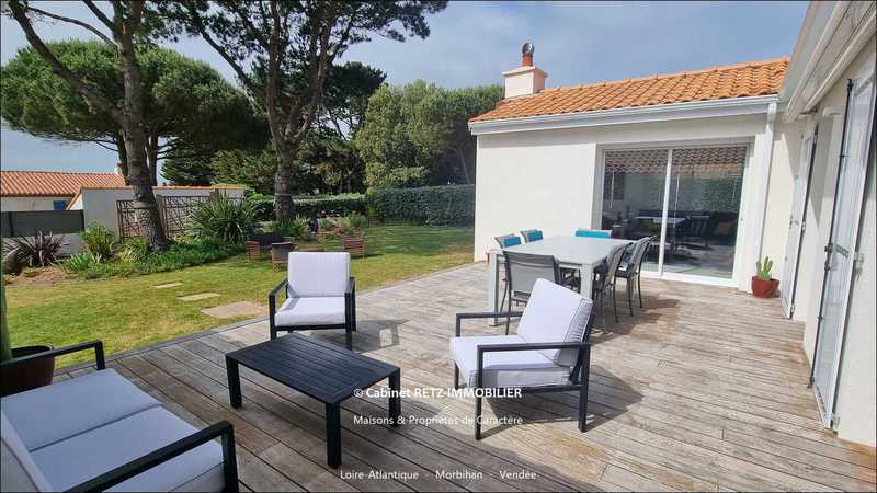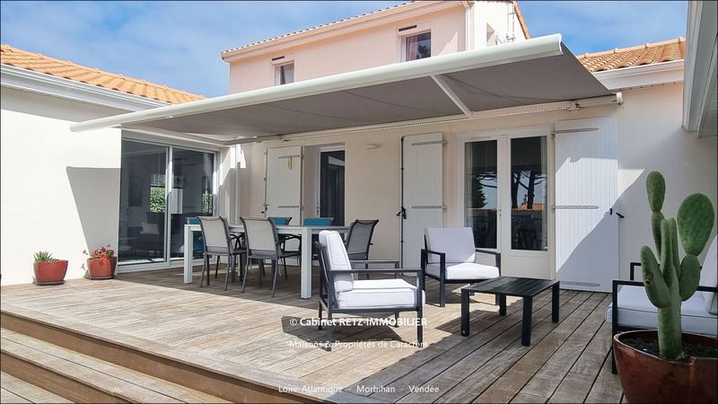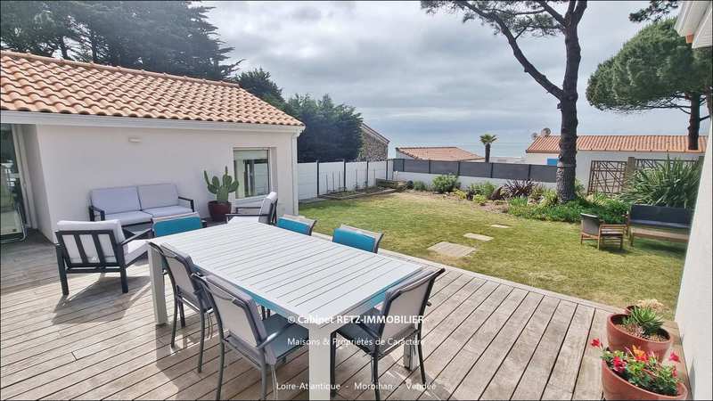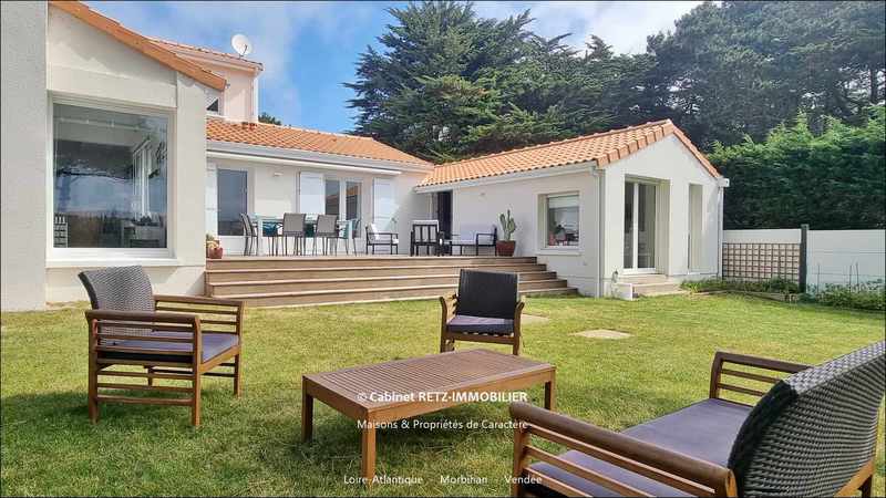 Vente Charmante & agréable maison contemporaine parfait état offrant VUE MER, 185m² habitables dont 5 chambres et bureau, belle réception et terrasse SUD, garage, beau jardin aménagé et paysagé (860m²) au calme de sa rue privée, à 250m des plages et 1500m d'un centre-bourg toutes commodités. OFFRE RARE ! Possibilité d'acquérir meublé sans supplément.
