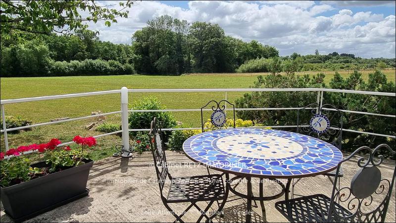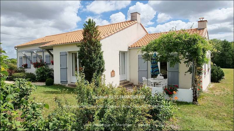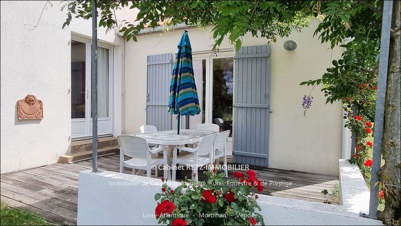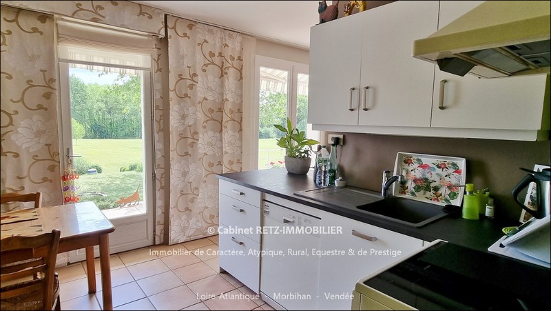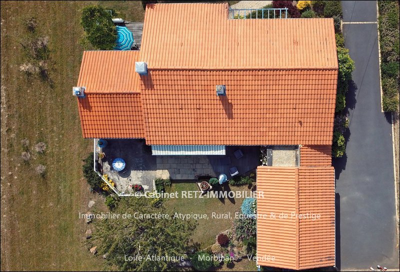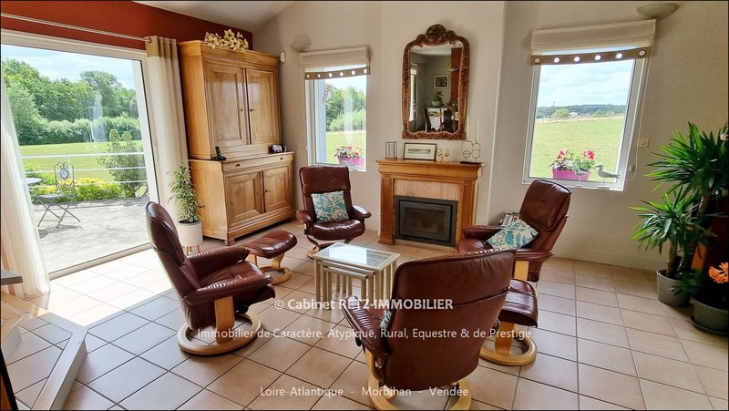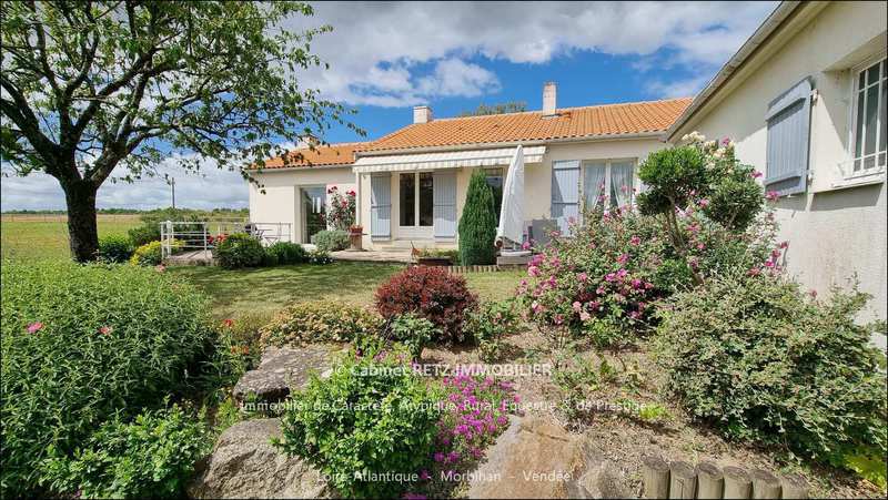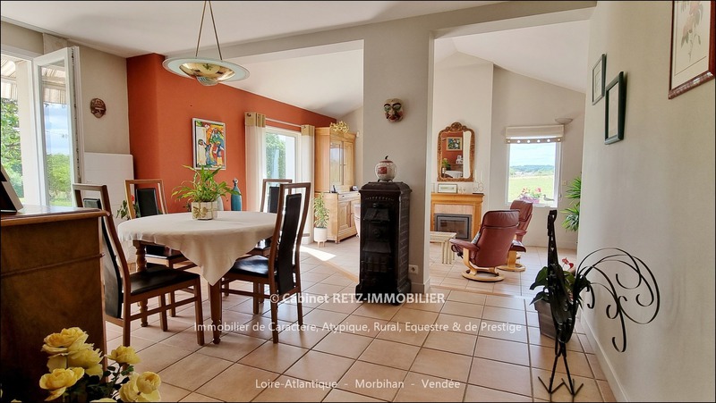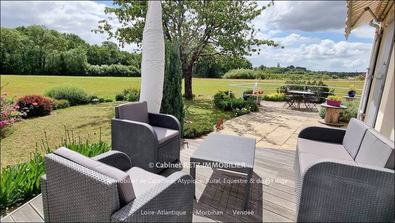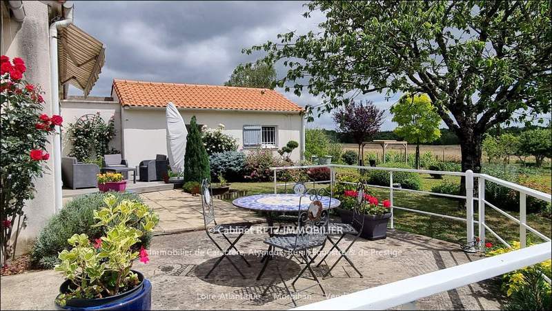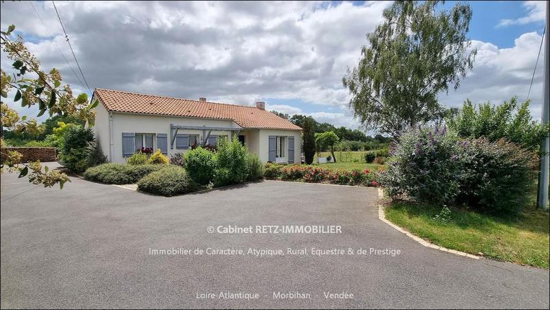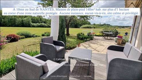 À 10mn de NANTES (sud), 3km des commodités, 4km gare SNCF, à l'abri des nuisances et de l'agitation, bénéficiant de belles vues dégagées sur la campagne Vente Maison de 180m² PLAIN-PIED (140m² hab., 4 chambres dont une suite), beau séjour cheminée, + garage double fermé 40m², + terrasses env. 65m² + parking en enrobé, ... VMC double flux, ballon thermodynamique, ... Sur terrain de 2800m² à + d'1 hectare au choix de l'acquéreur. Cadre de vie remarquable, emplacement privilégié pour les amoureux de calme et de campagne, de Nature et d'activités de plein air (marche, VTT, équitation, barque, canoé, ...). Très rare.