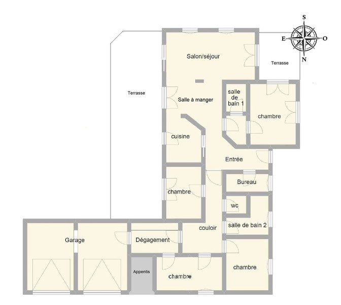 Rez-de-chaussée : Hall d’entrée poursuivi d’un dégagement avec placard ; Bureau avec placard ; Séjour - salle à manger traversant (triple exposition) avec 2 portes-fenêtres et 1 baie à galandage donnant accès aux terrasses de part et d’autre de la maison, présence dans le salon d’un poêle nordique installé dans une magnifique cheminée en brique et merisier de Loire ; Cuisine aménagée (semi-ouverte sur salle à manger) disposant d’une porte fenêtre donnant accès direct à la grande terrasse ; Chambre 1 en suite parentale (avec portes-fenêtres sur jardin et terrasse) dont dressing et salle de douche ; Dégagement avec placard ; Chambre 2 avec placard et porte-fenêtre vers grande terrasse ; Chambre 3 avec placard ; Chambre 4 (actuellement à usage de salle de sport, cave à vin et rangements) ; Salle de bain (plan double vasques sur meuble, baignoire, sèche-serviette, fenêtre) ; WC suspendu avec lave-mains sur meuble de rangement ; Dégagement à usage de réserve / cellier ; Zone technique (électricité, ECS, …) faisant le lien avec les 2 garages disposant de portes à ouverture télécommandée, coin lingerie avec évier, faux grenier de rangement, porte de service vers jardin.