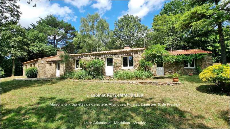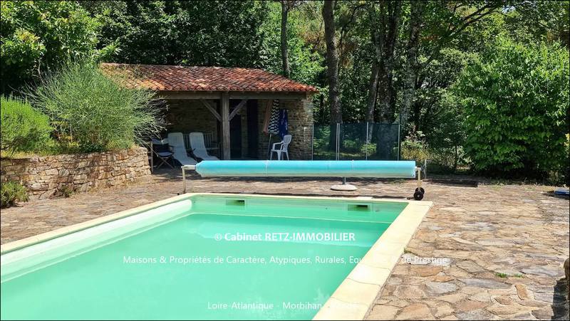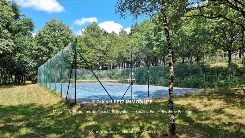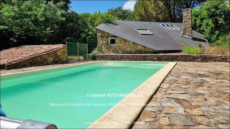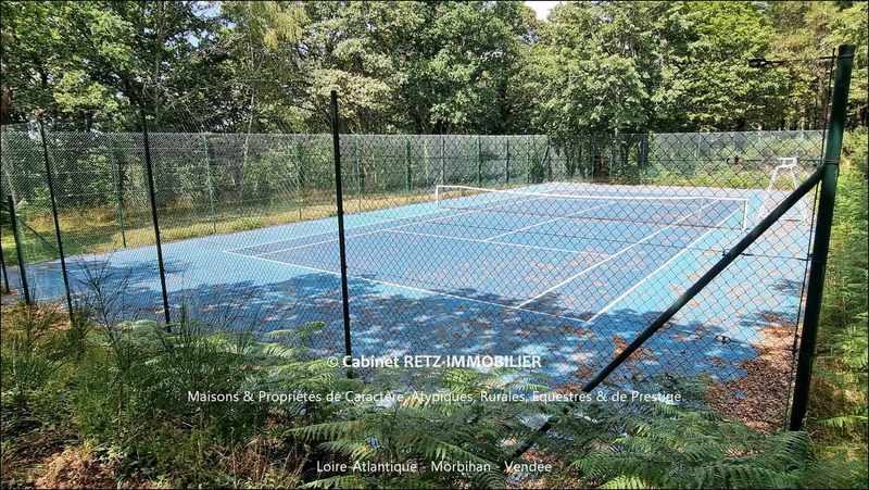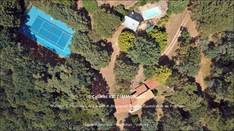Entre Nantes et La Baule / Saint-Nazaire, Ravissante Propriété boisée avec court de tennis, espace piscine avec pool-house, Maison de campagne de plain-pied en pierre apparente d’environ 140m² habitables + diverses dépendances pour 80m² environ. L’ensemble sur 4,90 hectares à 5km des commodité, 8,5km d’une gare SNCF, 20mn de NANTES, 35mn des plages.